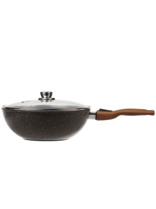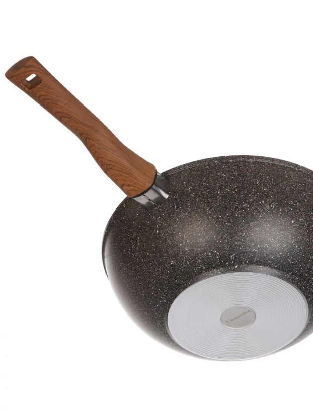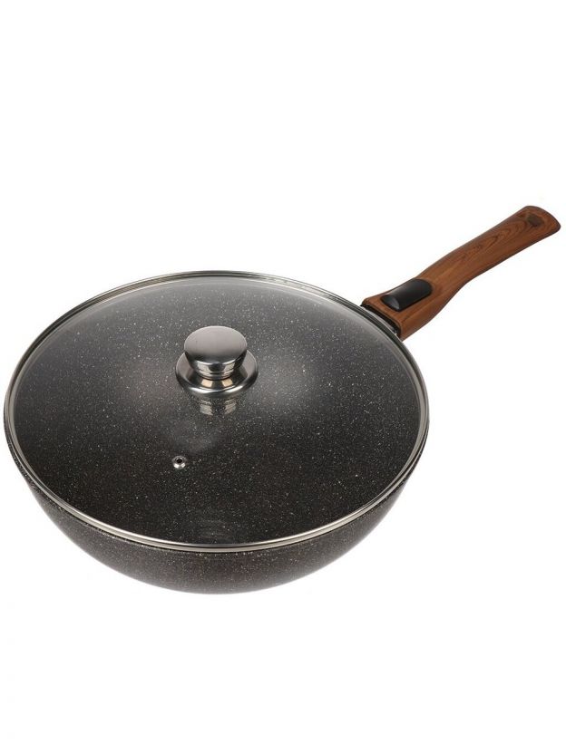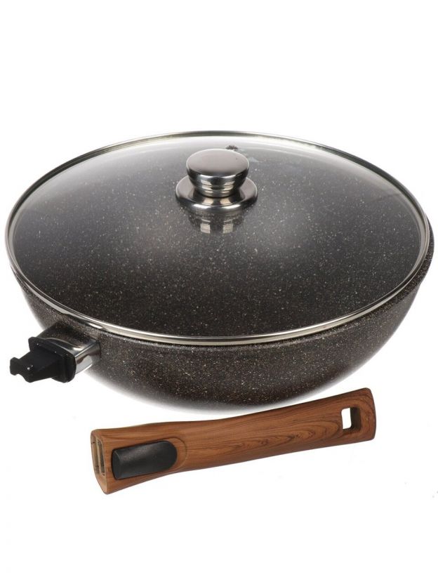 Многие спрашивают: «Как выбрать вок для дома?» или «Чем отличается гранитное покрытие от обычного?». Гранитное покрытие устойчиво к царапинам и долговечнее стандартных антипригарных слоёв, а литой алюминий обеспечивает легкость и надежность. Съемная ручка делает вок компактным для хранения и мытья в посудомоечной машине. Модель подходит для газовых, электрических, стеклокерамических и галогеновых плит, но не для индукции — это важно учитывать при покупке.