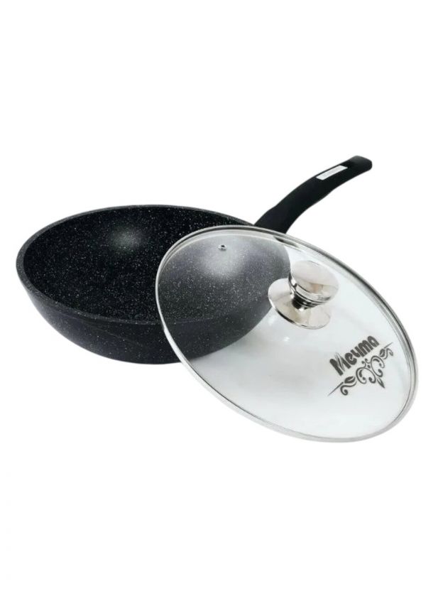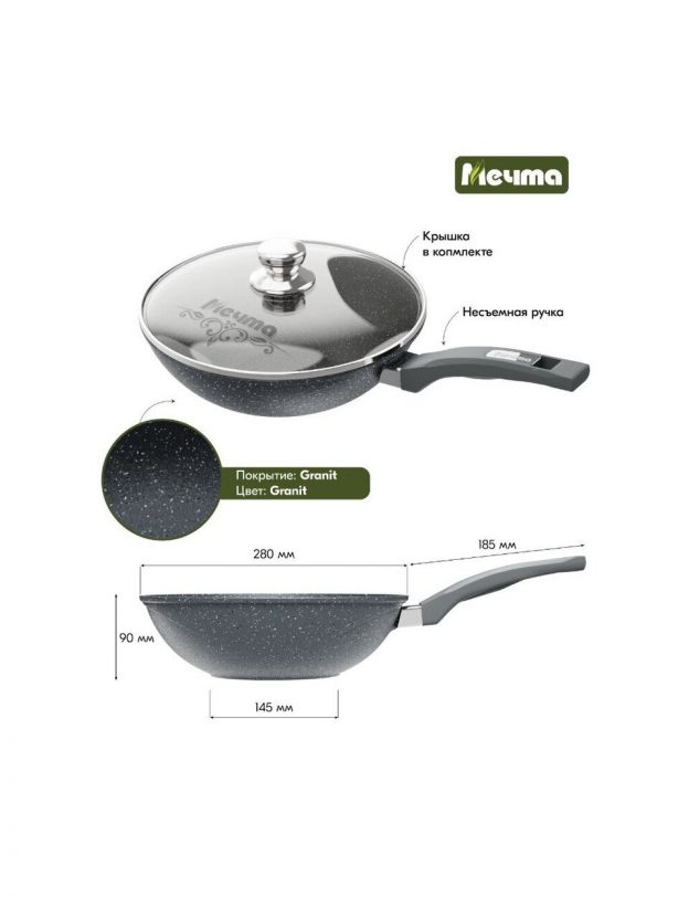 Сковорода-вок 28 см с крышкой Мечта Гранит black — современное решение для тех, кто ищет, какую сковороду выбрать для жарки без масла, тушения овощей или приготовления азиатских блюд. Литой алюминий обеспечивает быструю и равномерную теплопередачу, а гранитное антипригарное покрытие гарантирует простое очищение и долгий срок службы. Благодаря высокой стенке (9 см) и толстому дну (6 мм) вок отлично подходит для интенсивной обжарки и тушения, не деформируется и не теряет свойств даже при частом использовании.