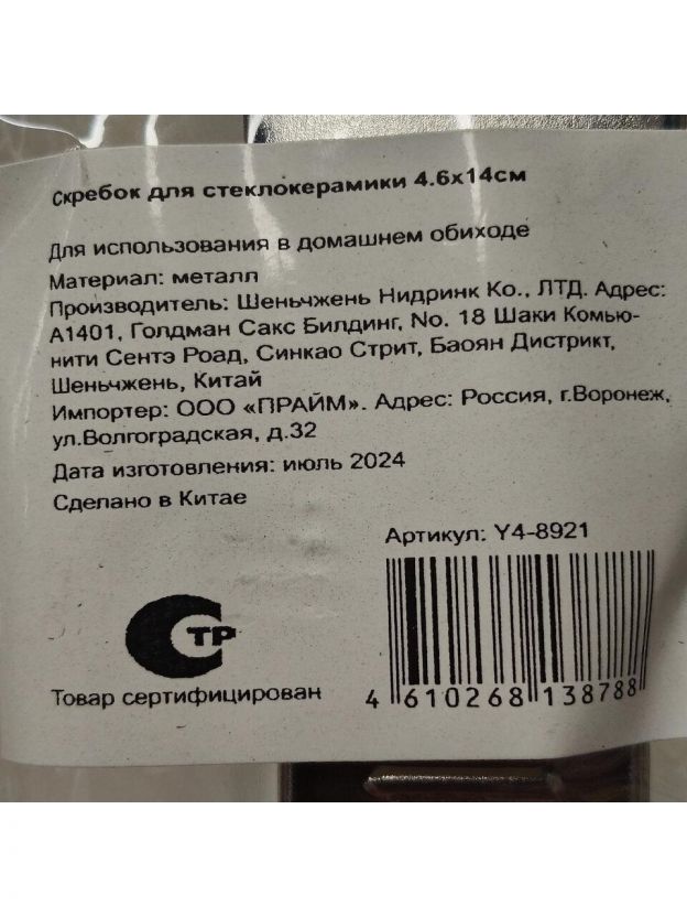 Идеальный инструмент для ухода за стеклокерамической плитой – скребок для стеклокерамики металл, 4.6х14 см, Y4-8921. Этот аксессуар обеспечивает эффективное очищение, не повреждая поверхность.