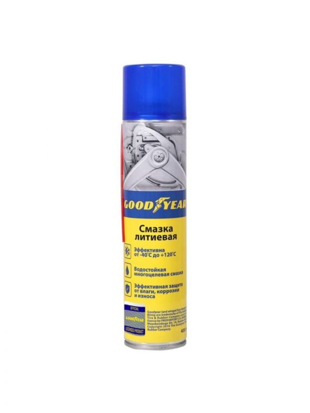 Литиевая смазка от Goodyear сохраняет свои свойства при работе в экстремальном температурном режиме (от -40 _С до +120 _С). Упаковка-аэрозоль позволяет удобно наносить средство на обрабатываемую поверхность. Благодаря наличию насадки-трубочки состав легко применять даже в труднодоступных местах.