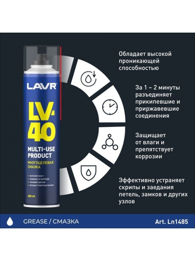 Смазка автомобильная Lavr LV-40 – это универсальное средство, предназначенное для ухода за автомобилем. Она эффективно вытесняет влагу, защищает от коррозии, устраняет скрипы и заедания, смазывает любые узлы и механизмы.