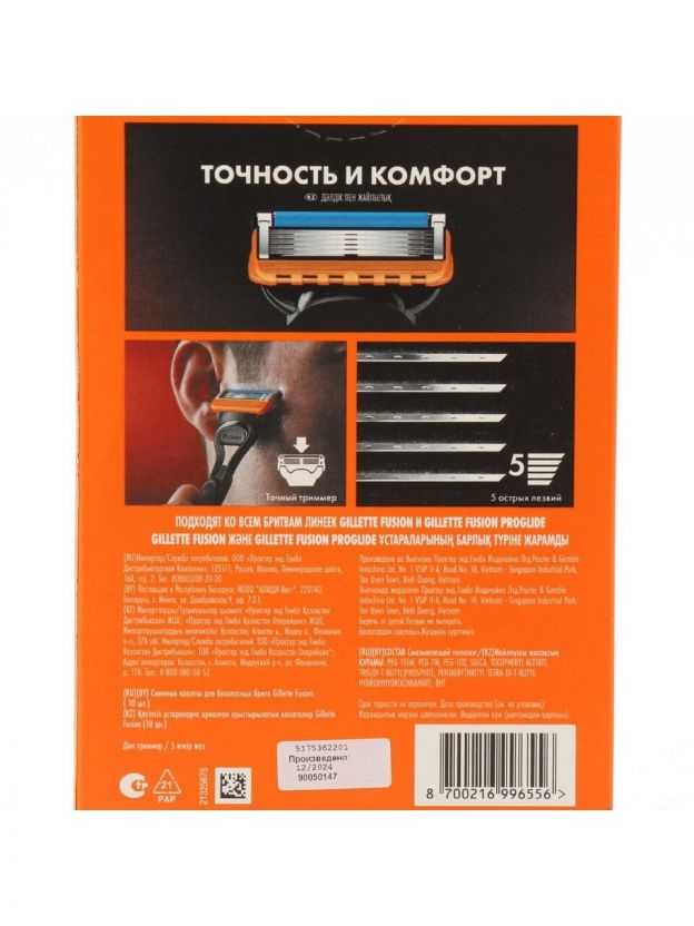 Сменные кассеты для бритв Gillette Fusion, 10 шт — гладкое бритьё до 5 недель без раздражения. Ощутите комфорт и экономию для дома, дачи и путешествий. Почему выбирают: 5 ультратонких лезвий Gillette Fusion для чистого и безопасного бритья без пропусков Оригинальные сменные кассеты: подходят для всех станков Fusion, срок службы одной кассеты — до 4-5 недель Универсальный формат — удобно брать с собой, выгодно покупать комплектом для всей семьи или в подарок Сменные кассеты для бритв Gillette Fusion — это выбор мужчин, которые ценят результат и комфорт. Благодаря пяти лезвиям с антикоррозийным покрытием, кассеты обеспечивают максимально гладкое скольжение и минимизируют риск раздражения даже на чувствительной коже. Комплект из 10 штук — практичное решение для тех, кто ищет, как купить недорого сменные кассеты для дачи или дома, а также для частых поездок. Пользователи часто спрашивают: чем отличаются кассеты Gillette Fusion от других? В отличие от стандартных систем, Fusion оснащён дополнительной увлажняющей полоской, что продлевает срок службы и делает бритьё комфортным до последнего использования. Как использовать сменные кассеты? Просто замените старый блок на новый — система крепления подходит ко всем станкам Fusion, не требует усилий и специальных навыков. Если вы ищете, какой комплект сменных лезвий выбрать для подарка или домашнего использования, обратите внимание на этот вариант: оптимальное соотношение цены и количества, оригинальная упаковка и гарантия подлинности. В отличие от аналогов, кассеты Fusion обеспечивают длительный ресурс без потери качества бритья. Сделайте заказ прямо сейчас — получите сменные кассеты Gillette Fusion с быстрой доставкой и официальной гарантией. Выгодная цена, оригинальный товар и уверенность в результате каждый день. Частые вопросы: Для каких станков подходят эти кассеты? Сменные кассеты совместимы со всеми мужскими бритвенными станками серии Gillette Fusion. Артикул: 0050016379. Сколько времени служит одна кассета? Одна кассета рассчитана на 4-5 недель регулярного использования, что выгодно для ежедневного ухода и экономии бюджета. Сколько штук в упаковке и какой размер? В комплекте 10 оригинальных сменных кассет. Размер каждой кассеты стандартен для линейки Fusion, подходит для всех одноимённых станков.