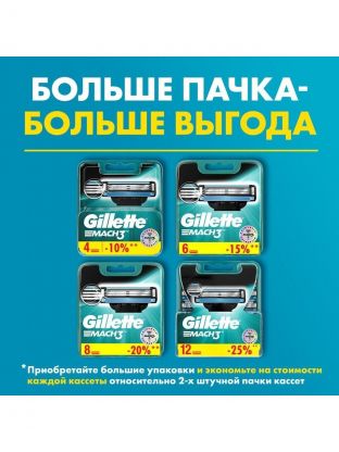 Gillette – марка, которая принадлежит компании Procter & Gamble. Gillette производит аксессуары для бритья и ухода за телом. Компания Gillette придерживается строгого контроля качества выпускаемой продукции в соответствии со всеми стандартами. Характеристики: Бренд: Gillette; Тип: сменные кассеты для бритья. Преимущества: Герметичная упаковка сохранит лезвия до момента использования в заводском состоянии, даже во влажном помещении; Сменные кассеты для Gillette Mach3 разработаны для точного бритья, на которое вы можете с уверенностью рассчитывать; Три лезвия прочнее, чем сталь, остаются острыми дольше, а улучшенная увлажняющая полоска шире и выделяет больше смазывающих веществ.
