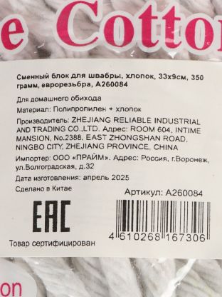 Обратите внимание на тип крепления — этот блок оснащён стандартной еврорезьбой и подходит для большинства швабр. Размер насадки 33х9 см, материал — хлопок, артикул A260084.