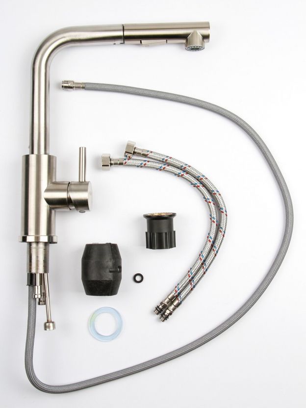 Высокий поворотный излив облегчает мытьё крупной посуды, а гибкая подводка и стандартное крепление позволяют легко установить смеситель самостоятельно без вызова сантехника.