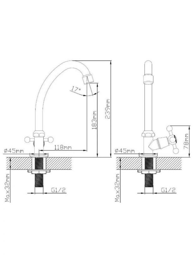 Смеситель рассчитан на одно монтажное отверстие диаметром 35 мм, стандарт подключения — 1/2", высота излива 18,3 см, длина 11,8 см. Крепление осуществляется гайкой, в комплекте гибкая подводка не предусмотрена.