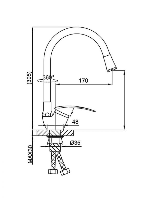 Для установки требуется одно отверстие диаметром 48 мм — стандарт для большинства кухонных моек. Крепление осуществляется гайкой, гибкая подводка с резьбой 1/2".