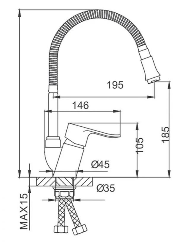 Высота излива — 18,5 см, длина — 19,5 см. Это оптимальные параметры для большинства кухонных моек.