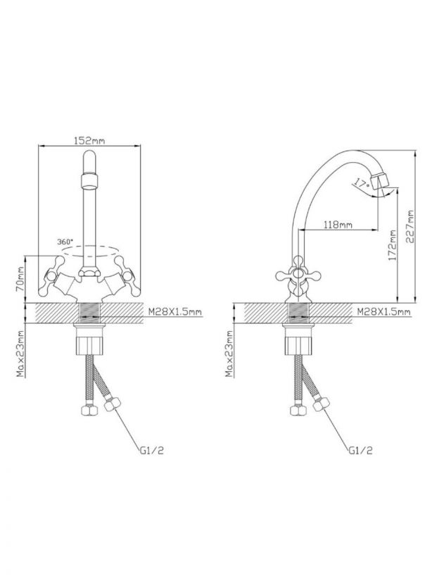 - Высокий поворотный излив 17,2 см — удобно мыть крупную посуду и наполнять высокие ёмкости