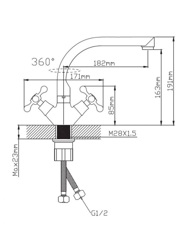 Высота излива — 19,1 см, длина — 18,2 см. Излив поворотный, средний по размеру, подходит для большинства кухонных моек.