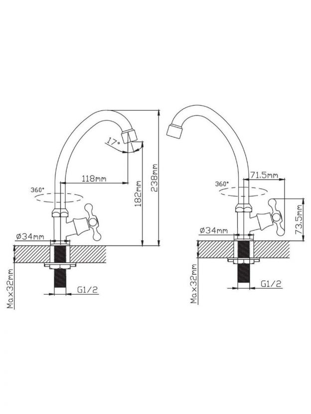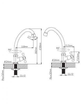 Модель рассчитана на одно монтажное отверстие диаметром 25 мм, крепление осуществляется гайкой. Высота излива — 18,2 см, длина — 11,8 см.
