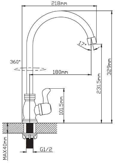 Монтаж в одно отверстие диаметром 20 мм, крепление гайкой, стандартная подводка 1/2", длина излива — 18,4 см, горизонтальное расположение.