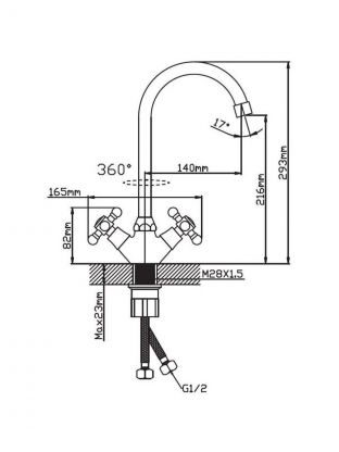 Длина излива — 17,1 см, излив поворотный, что удобно для мытья посуды и наполнения ёмкостей разных размеров.