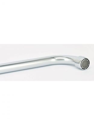 Длина поворотного излива — 28,2 см, высота — 17 см. Это средний размер, удобный для большинства кухонных раковин.