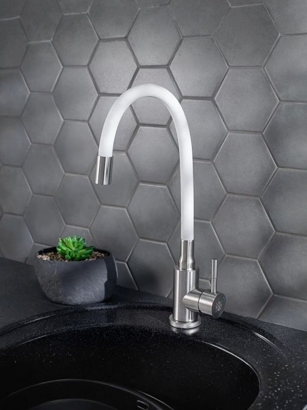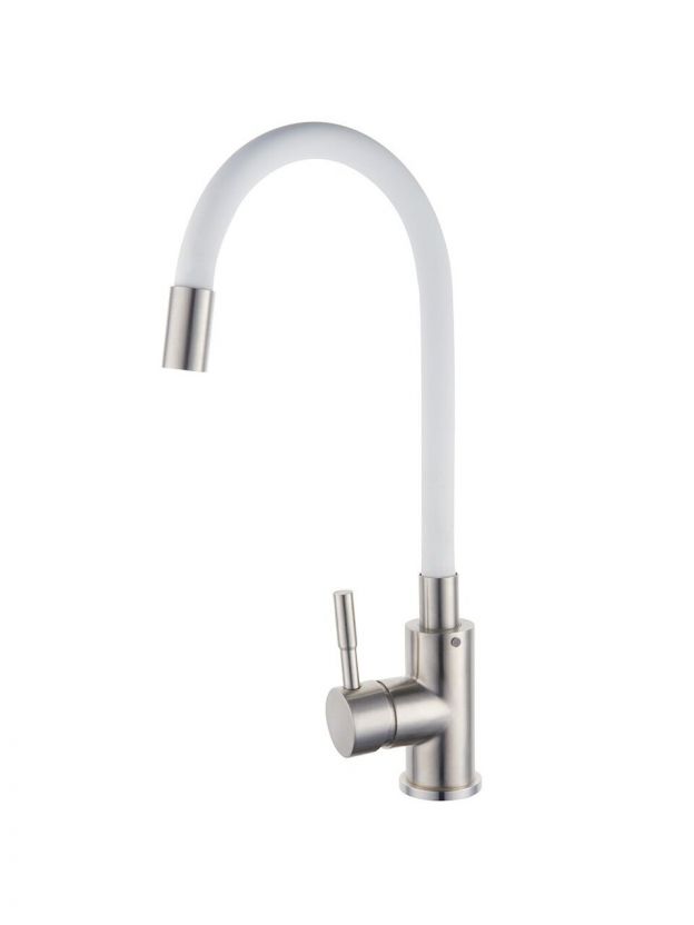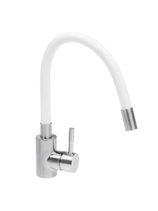 Смеситель для кухни РМС SUS124W-016F с гибким изливом: универсальное решение для современной кухни. Белый цвет, нержавеющая сталь, гарантия 7 лет.