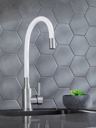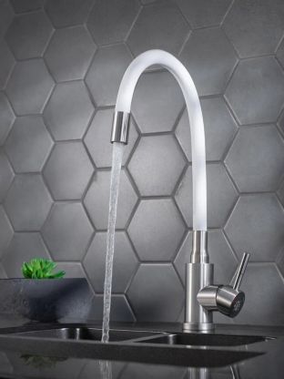 Смеситель РМС SUS124W-016F с гибким изливом и монтажом на одно отверстие отлично подходит для компактных кухонь. Гибкий излив позволяет экономить место и легко направлять поток воды.