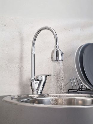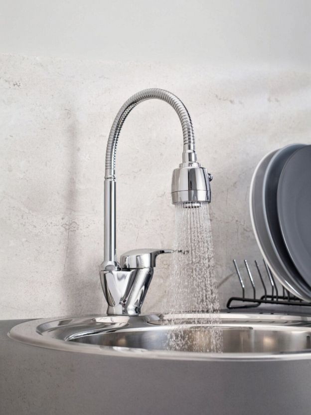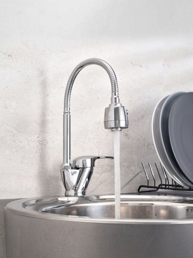 Гибкий высокий излив (49 см) позволяет легко мыть габаритную посуду, направлять поток воды точно туда, куда нужно, и экономить время на кухне.