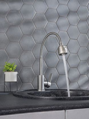 Длина излива — 21 см, высота — 38 см. Это оптимально для стандартных и глубоких кухонных моек.