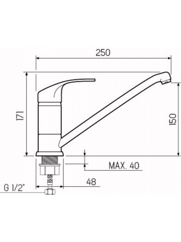 Для установки требуется одно монтажное отверстие диаметром 40 мм. Крепление осуществляется гайкой, стандарт подключения шланга — 1/2".