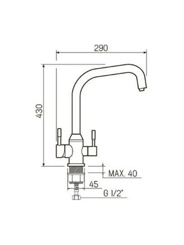 Высота излива — 43 см, длина — 24 см. Такой размер подходит для глубоких и стандартных моек, облегчает мытьё крупной посуды и наполнение высоких ёмкостей.