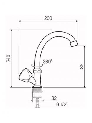 Высота излива — 18,5 см, длина — 13 см, диаметр монтажного отверстия — 35 мм, крепление — гайка, стандарт подводки — 1/2". Монтируется горизонтально через одно отверстие.