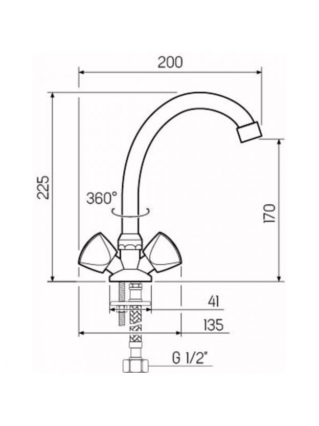 Корпус выполнен из цинкового сплава с глянцевым хромированием. Высота излива — 17 см, длина — 13 см, стандарт крепления — гайка.