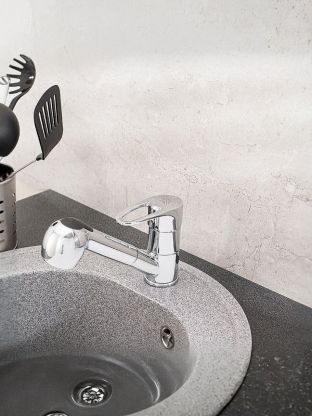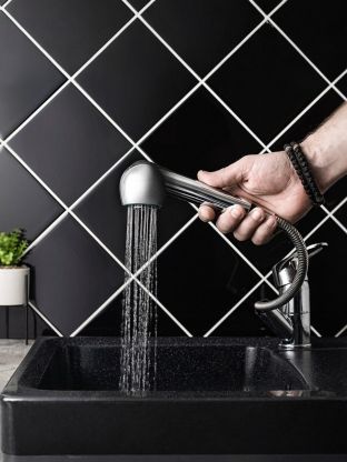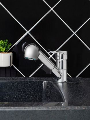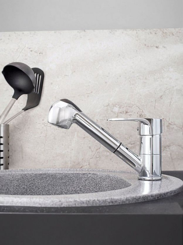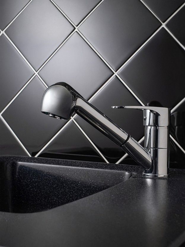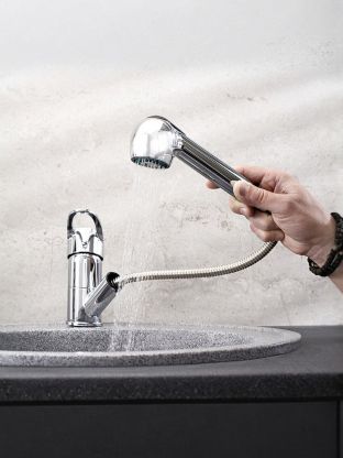 • Выдвижной излив — легко наполнять высокие кастрюли, мыть овощи и труднодоступные зоны