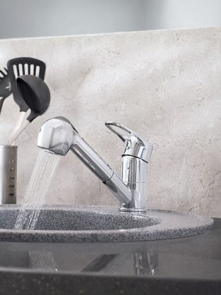 Выдвижной излив облегчает мытьё крупной посуды, наполнение кастрюль и уход за мойкой, а также помогает экономить воду благодаря встроенному аэратору.