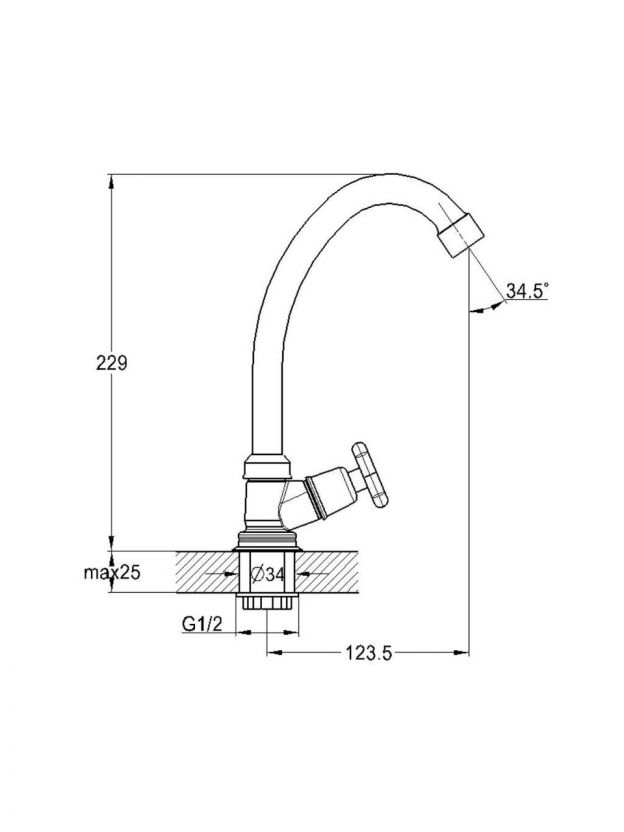 Для монтажа требуется одно отверстие диаметром 34 мм, стандартная подводка — 1/2 дюйма. Крепление осуществляется гайкой, что обеспечивает простую и надежную фиксацию.