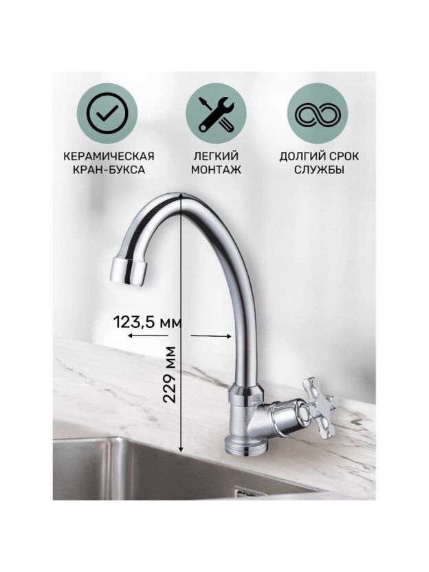 Корпус выполнен из цинкового сплава, поверхность — глянцевый хром. Длина поворотного излива составляет 12,4 см, что идеально для компактных кухонных моек.