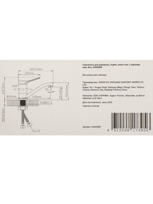 Обратите внимание на длину и высоту излива. У Aqwin A45292W короткий излив (14.6 см) и высота 7.6 см — оптимально для компактных раковин и экономии пространства.