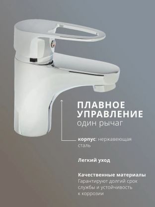 Корпус выполнен из цинкового сплава с глянцевым хромированием, а запорный механизм — керамический картридж. Такая комбинация обеспечивает до 5 лет эксплуатации без протечек и коррозии.