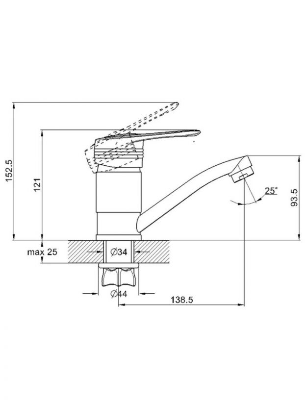 Для монтажа требуется одно отверстие диаметром 34 мм. Крепление осуществляется гайкой, стандарт подключения шланга — 1/2".