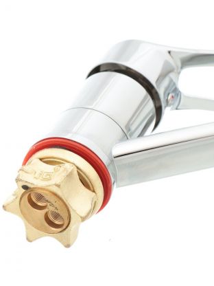 Корпус изготовлен из латуни с глянцевым хромированным покрытием, что обеспечивает устойчивость к коррозии и долгий срок службы даже при интенсивном использовании.