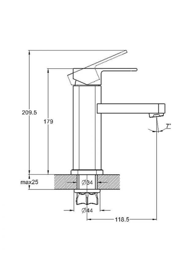 Длина излива 11,9 см, форма плоская, монтаж через одно отверстие 34 мм — оптимально для компактных раковин в ванной или на кухне.