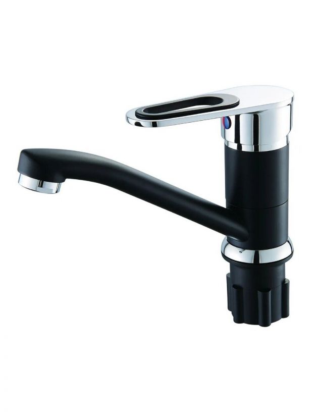 - Современный черный смеситель с глянцевой поверхностью и плоской формой — акцент в интерьере.