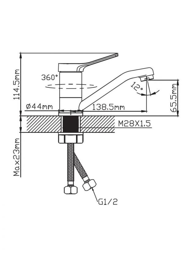 Высота излива — 65 мм, длина излива — 13,8 см, монтажное отверстие — 35 мм, стандарт подводки — 1/2".