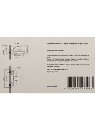 Смеситель рассчитан на стандартный монтаж в ванной, подходит под типовые сантехнические выводы, не требует дополнительных переходников. Артикул: A3032, цвет — хром.