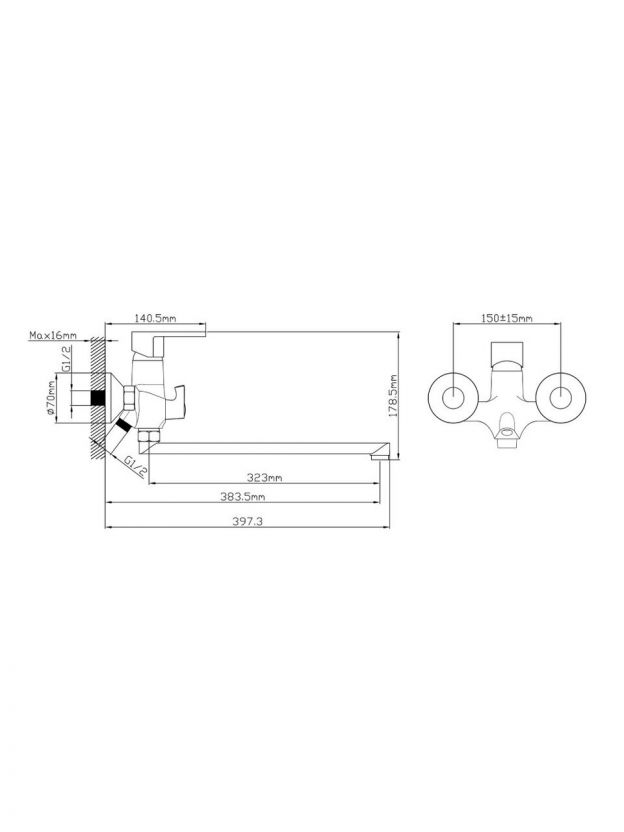 Смеситель устанавливается вертикально на стену с помощью эксцентриков; подходит для стандартных межосевых расстояний 150 мм и монтажных отверстий диаметром 70 мм.