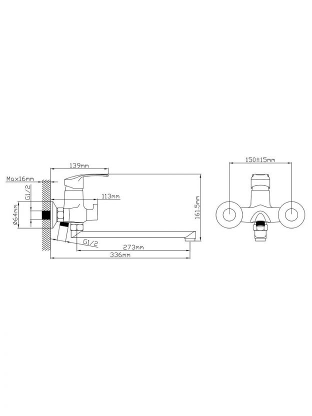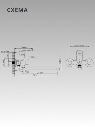 Смеситель предназначен для вертикального настенного монтажа на два стандартных отверстия с межосевым расстоянием 150 мм и диаметром 12.7 мм, крепление — эксцентрики.