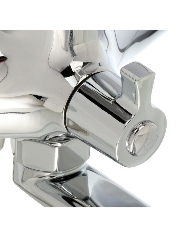 Корпус выполнен из цинкового сплава с глянцевым хромированным покрытием, длина поворотного излива — 30 см, что удобно для большинства стандартных ванн.