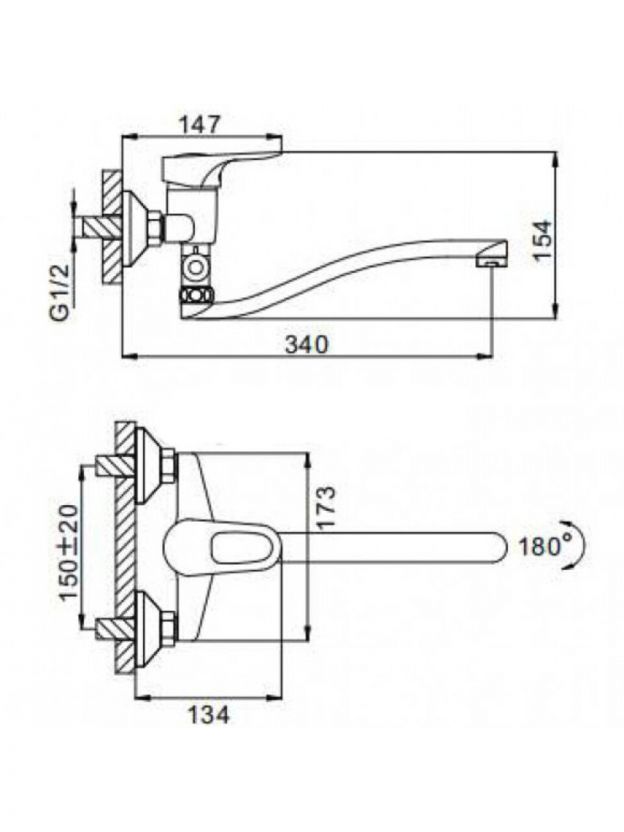 Длина поворотного излива — 30 см, монтаж вертикальный (настенный) на 2 отверстия с межосевым расстоянием 150 мм. Стандарт подводки шланга — 1/2".