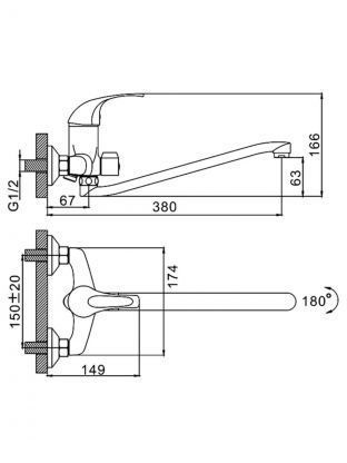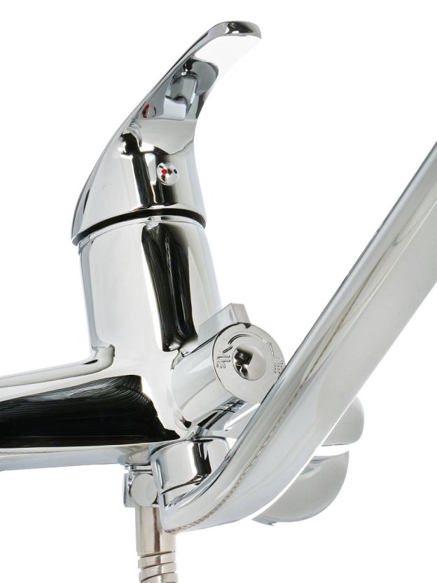 Смеситель устанавливается вертикально на стену с помощью эксцентриков, подходит для стандартных двух отверстий (межосевое расстояние 150 мм).