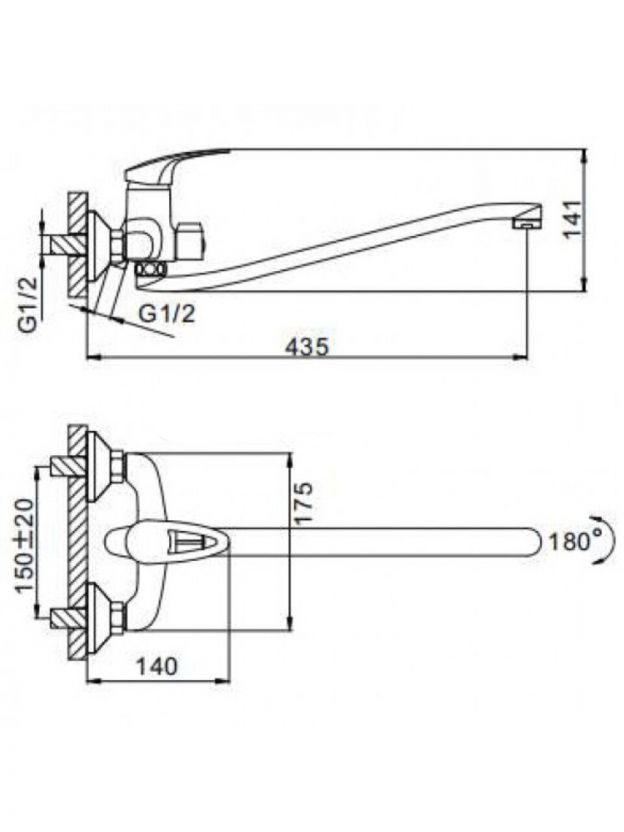 Смеситель устанавливается вертикально на стену с помощью эксцентриков, подходит для стандартных двухотверстных систем с межосевым расстоянием 150 мм.