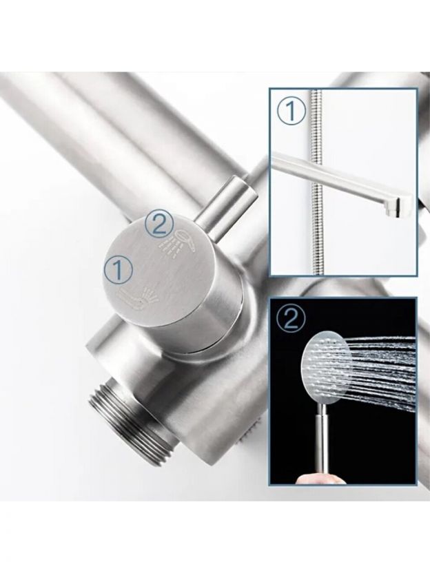 Frap F2248 — отличный выбор: корпус из нержавеющей стали, керамический картридж, длинный поворотный излив 35 см, лейка с держателем и шлангом 1,5 м. Монтируется вертикально на стену, подходит для стандартной подводки 1/2".