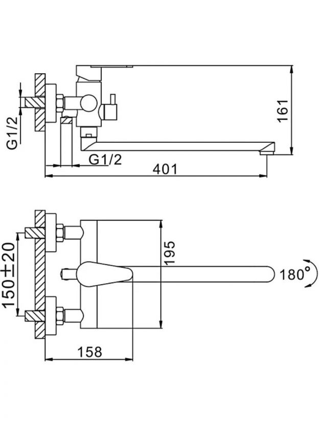 Длина излива — 35 см, межосевое расстояние для монтажа — 150 мм, крепление на 2 отверстия, стандарт подводки — 1/2". Установка настенная, вертикальная через эксцентрики.