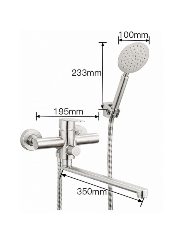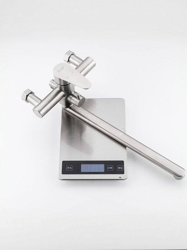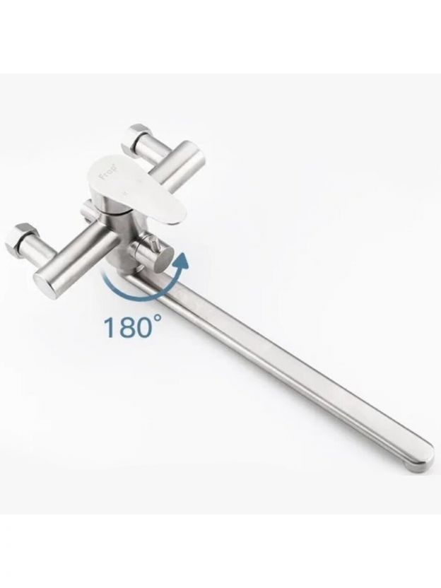 Смеситель для ванны Frap F2248 из нержавеющей стали — долговечное решение с длинным поворотным изливом 35 см, лейкой и аэратором для комфортного душа и экономии воды.