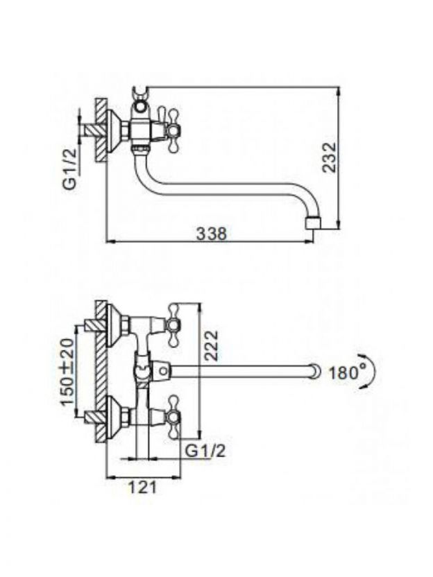 Длина излива — 30 см, межосевое расстояние — 150 мм, материал — латунь с хромированием, тип управления — двухвентильный, монтаж — вертикальный настенный, стандарт подводки — 1/2".