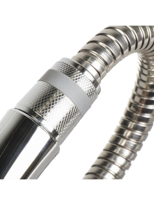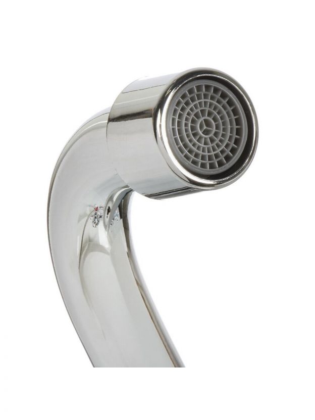 - Оптимальные параметры: длинный поворотный излив 30 см, глянцевая хромированная поверхность, межосевое расстояние 150 мм.