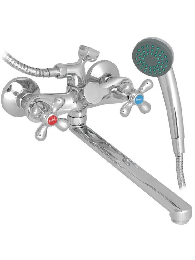 Смеситель для ванны Frap F22731-B: надежный выбор для ванной — 2 вентиля, длинный поворотный излив 30 см, аэратор и лейка в комплекте. Решение для дома и дачи.